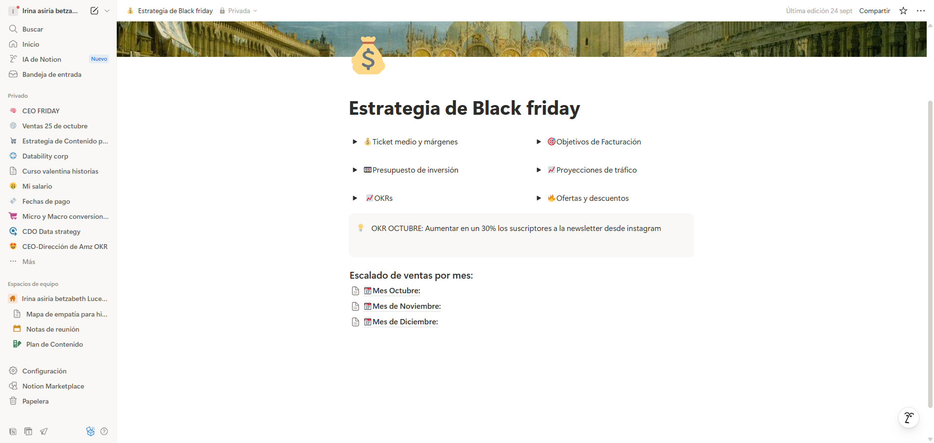 Plan de acción en Notion: estrategia paso a paso, con textos persuasivos y discurso de marca incluidos.